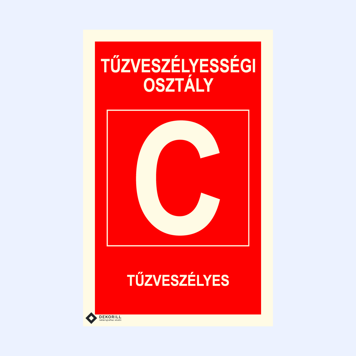 Tűzveszélyességi osztály C feliratú utánvilágító matrica vagy tábla mérsékelten tűzveszélyes területek jelölésére. Tűzvédelmi kategóriába sorolásra szolgál.