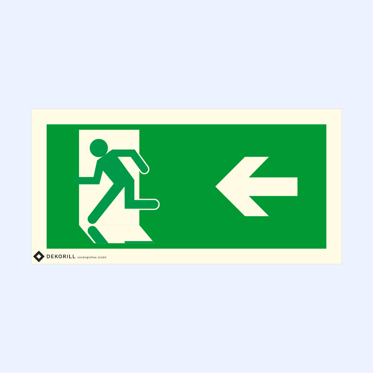 Utánvilágító fóliára nyomtatott, balra mutató vészkijárat jelölő matrica. Elérhető táblaként és külön matricaként is.