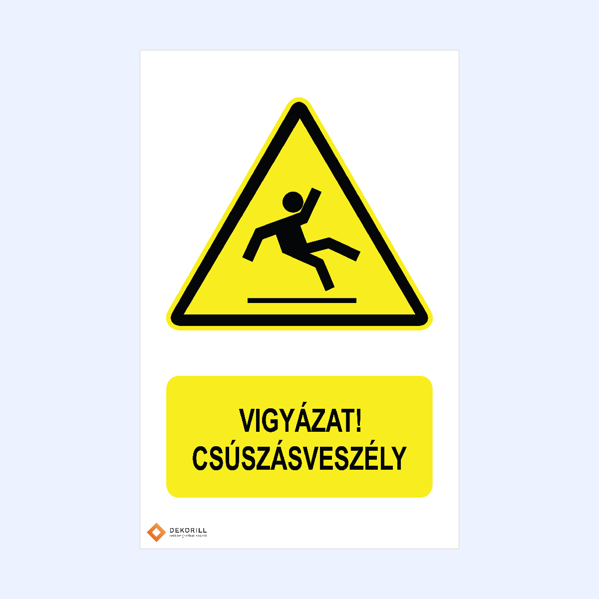 Vigyázat csúszásveszély feliratú matrica vagy tábla csúszós felületek jelölésére. Fontos balesetmegelőző figyelmeztetés.